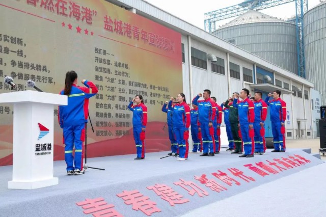 活動中,與會領導為12個圍繞服務重大項目而組成的青年集體突擊隊進行授旗,青年突擊隊、青年文明號代表作表態發言,并舉行了“強國復興有我 青春燃在海港”鹽城港青年宣誓儀式。