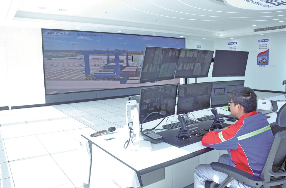 新技術(shù)帶來新變革,自動化碼頭便捷的操作、舒適的環(huán)境,改變了單人單機(jī)操作重型起重設(shè)備的歷史。在整個(gè)項(xiàng)目的“大腦”——中控室里,操作系統(tǒng)發(fā)出指令,新能源電動集裝箱卡車前往堆場,兩名軌道吊司機(jī)遠(yuǎn)程監(jiān)控著4臺自動化軌道吊,精準(zhǔn)定位,瞬間完成抓箱、落箱,集裝箱“一鍵著箱”精準(zhǔn)無誤。偌大的堆場,除了集裝箱卡車司機(jī),看不到其他工作人員。