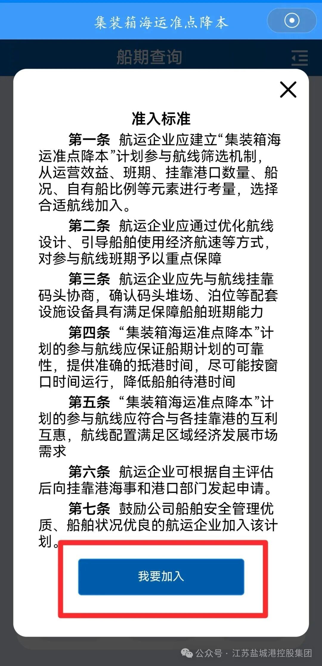 第三步:航運公司第一次登錄該模塊的用戶,系統(tǒng)默認顯示為船期查詢頁面,用戶點擊“申請加入”按鈕,選擇“我要加入”之后,輸入統(tǒng)一社會信用代碼、單位名稱、聯(lián)系電話、公司類型等相關信息,提交信息后,1-2個工作日之內,即可獲得完整的“準點降本”模塊使用權限。