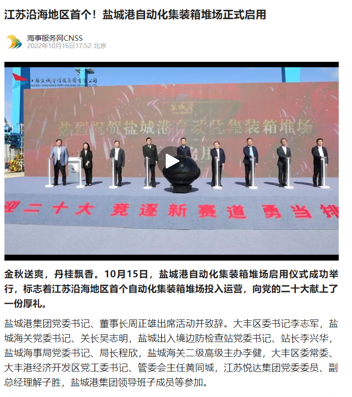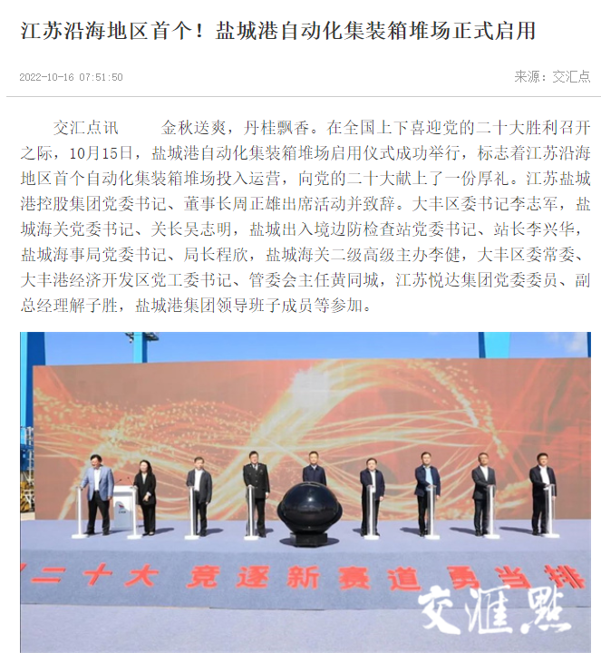 江蘇沿海地區(qū)首個(gè)自動(dòng)化集裝箱堆場(chǎng)——鹽城港大豐港區(qū)自動(dòng)化集裝箱堆場(chǎng)正式啟用