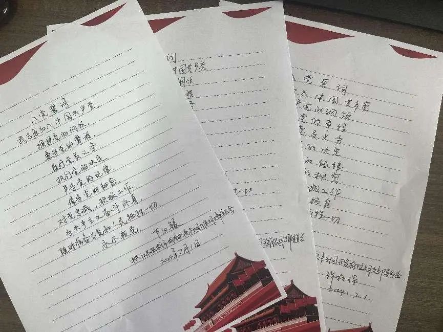 一筆一劃,書寫的是對黨的莊嚴承諾;一撇一捺,凝聚的是對黨的無限忠誠。黨員們懷著崇敬的心情,手握鋼筆,認真地抄寫著每一個字。每一個筆畫都充滿力量,每一句誓言都飽含深情。