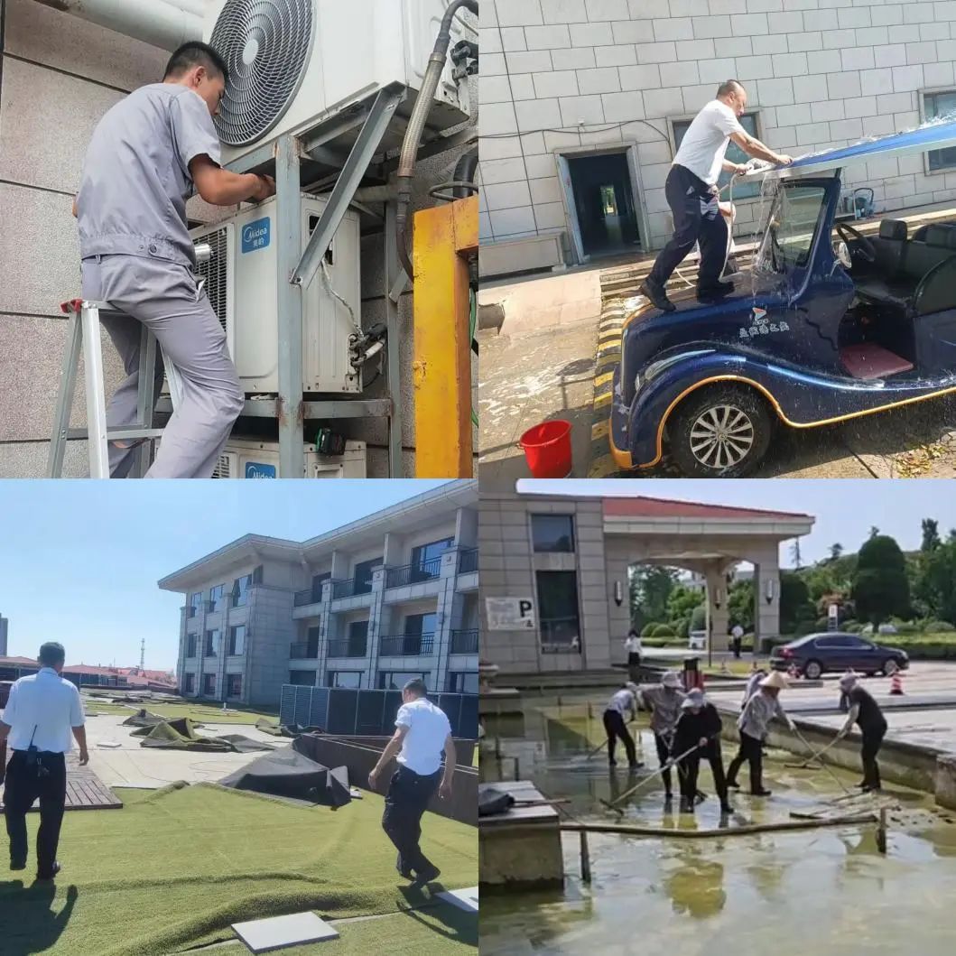 高溫擊不垮鹽城港人對事業的熱愛、對崗位的忠誠。頂著烈日的忙碌身影,鋪被風吹散的草坪、清理遍布綠色苔蘚的水池、清洗觀光車、維修設備.....,他們用強烈的責任心與可靠的專業技能,讓客戶用得放心。