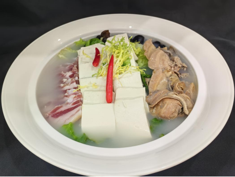 精選肥嫩的河蚌,經(jīng)過細(xì)致處理,去除雜質(zhì)后,蚌肉質(zhì)地緊實(shí)且富有彈性。咸肉選取肥瘦相間的優(yōu)質(zhì)部位,經(jīng)過腌制風(fēng)干,咸香醇厚,風(fēng)味獨(dú)特。將切成小塊的嫩滑豆腐與河蚌、咸肉一同燉煮,慢火細(xì)熬間,河蚌的鮮美、咸肉的醇厚油脂逐漸滲入豆腐之中,鮮香軟嫩,鮮香四溢。