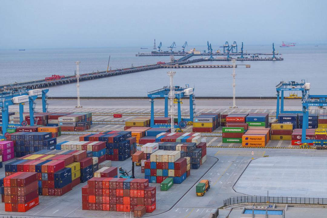 在大豐港集裝箱碼頭自動化控制中心,工作人員遠程操控著4臺自動化軌道吊,即可精準完成抓箱、落箱作業。400 畝的堆場內,除集卡司機外,不見一人值守。
