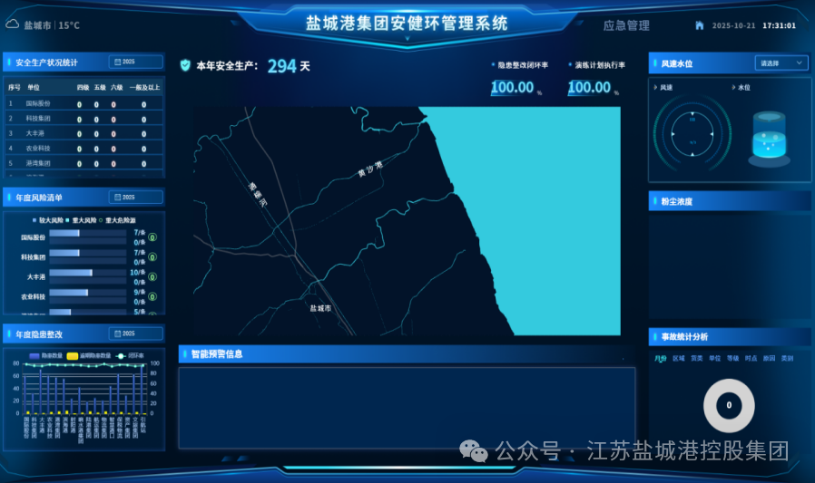 全力推進安健環管理系統落地,系統涵蓋安全管理、危貨管理、生態環境、職業健康等16大模塊,集成風險分級管控、隱患排查治理、智能監控等核心功能,當前已完成功能開發與測試,年內投入運營使用,最終實現安全環保工作數字化管理,打造“港口安全生產一張圖”。同時,完成電子口岸平臺網絡安全等級保護(二級)測評,為數據安全筑牢防護墻。